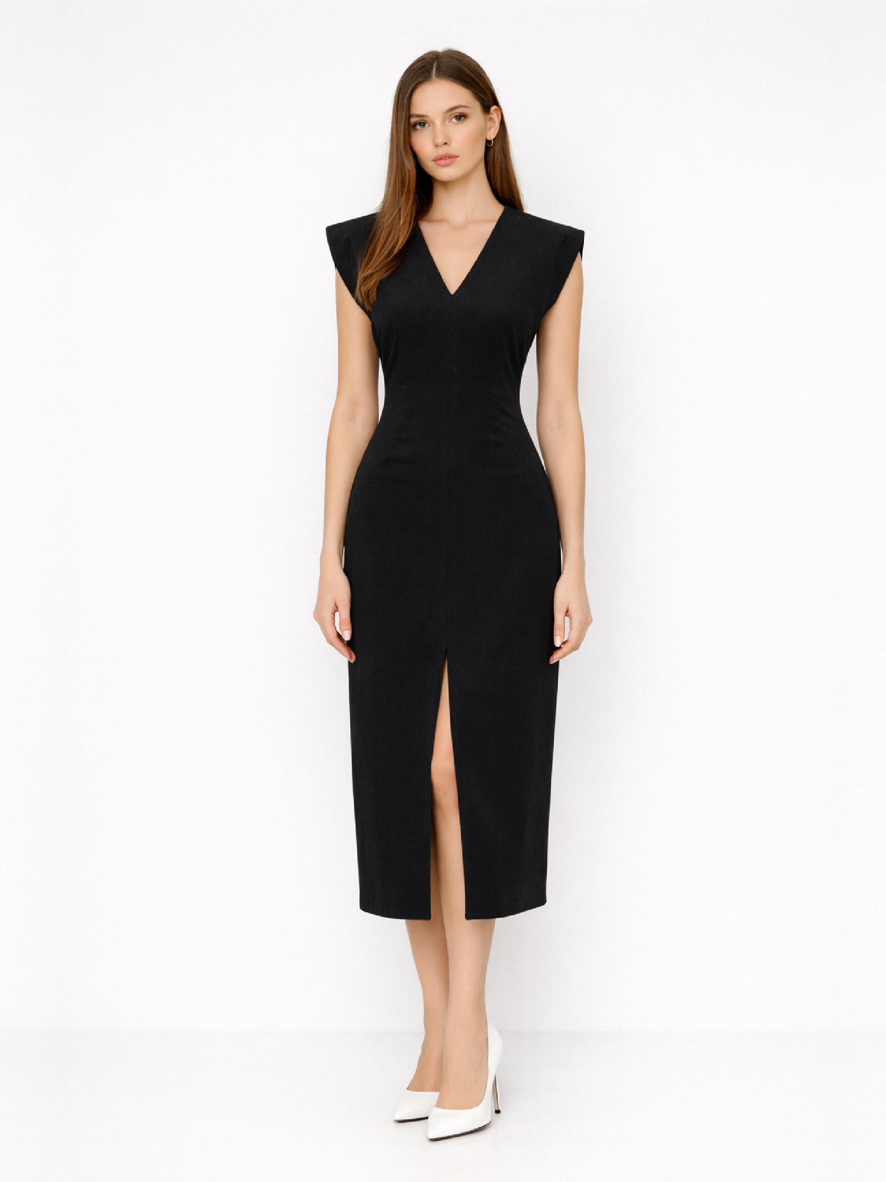 Rochie neagră midi cambrată cu decolteu în v și crăpătură în față și în spate harera hr26r001