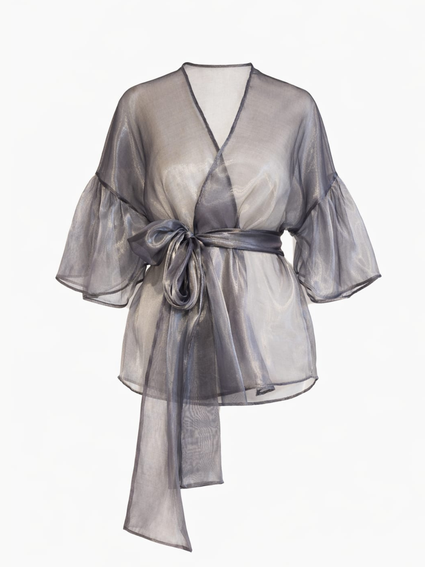 Top organza lucios elegant, gri H25T005 Harera, transparent cu cordon în talie