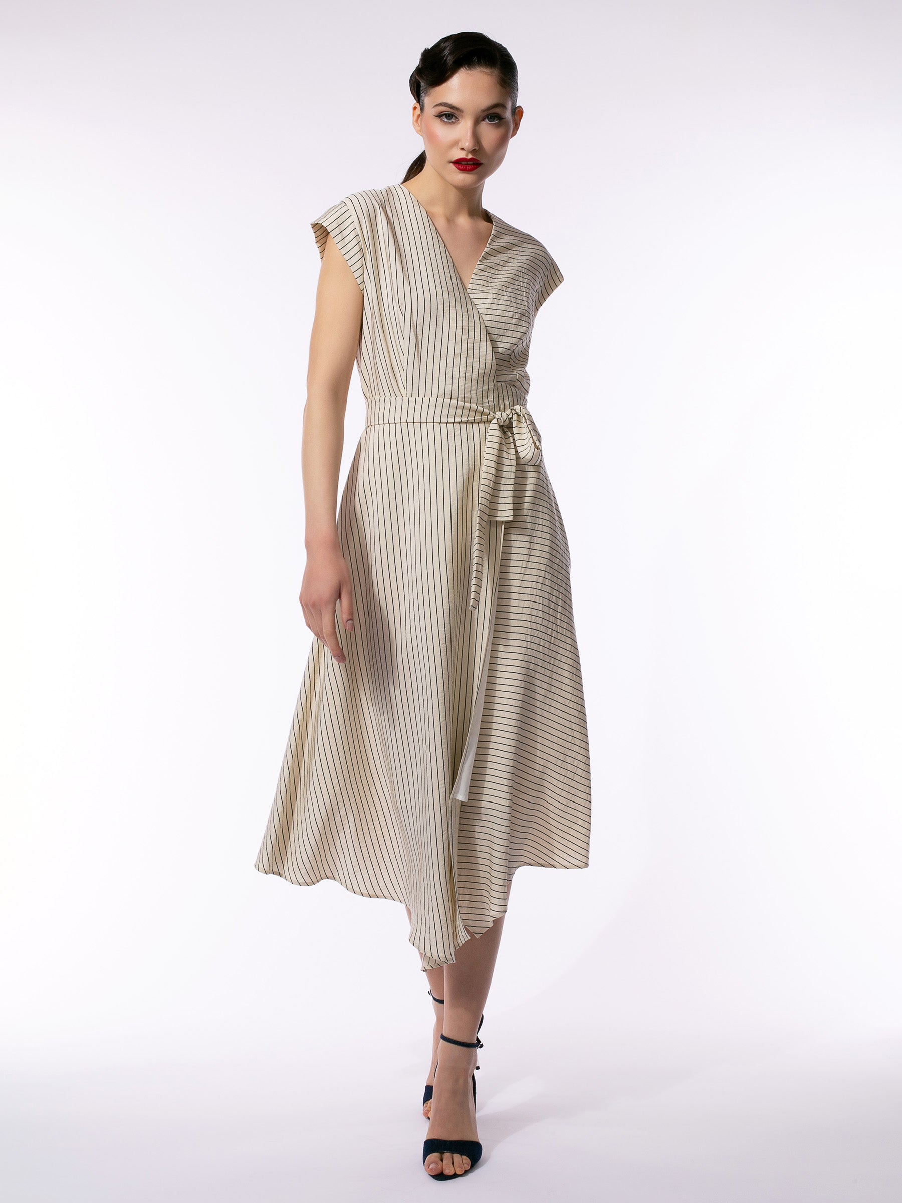 Rochie petrecută în dungi cu tiv asimetric striped wrap dress larisa dragna