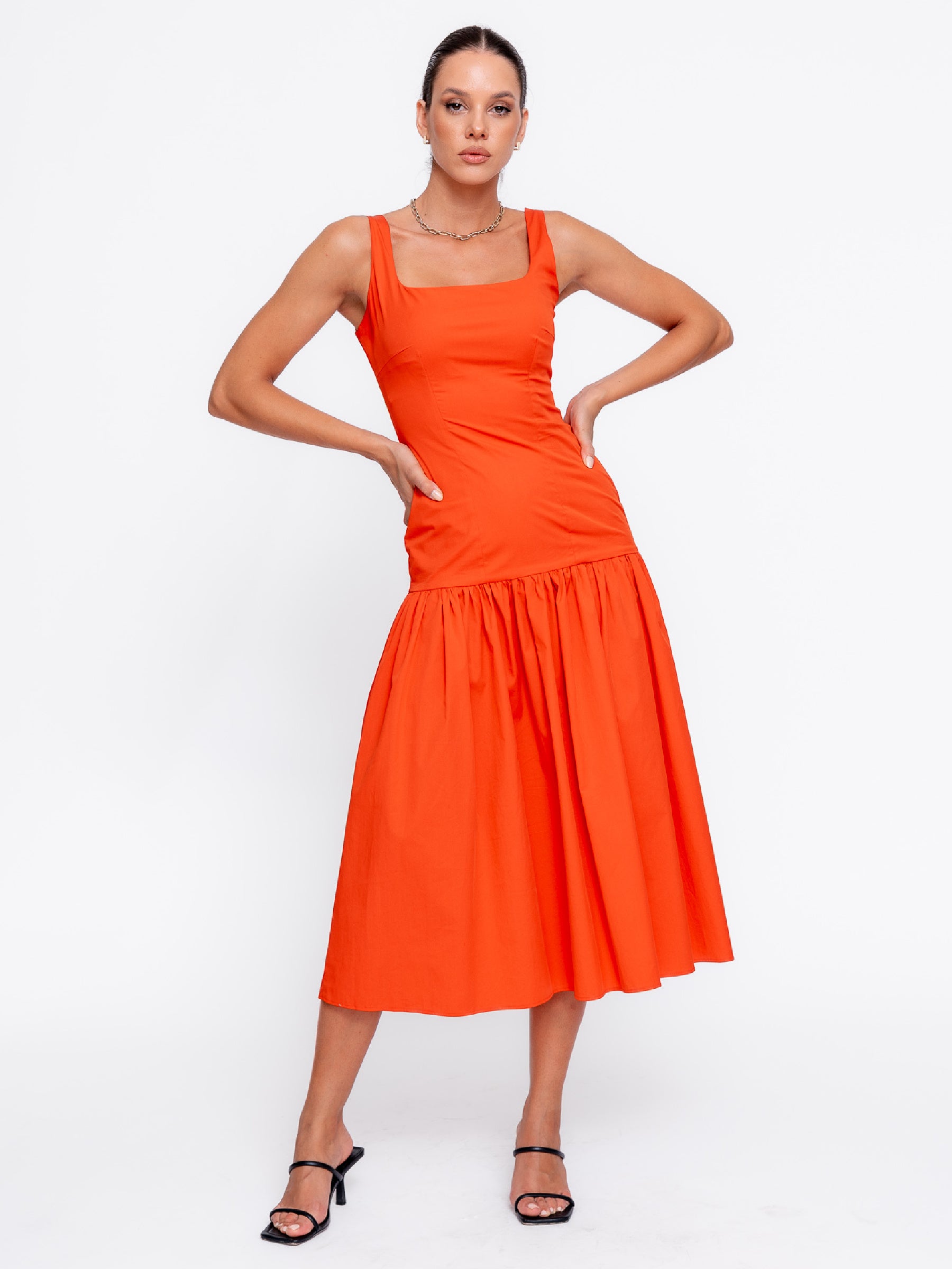 Rochie cambrata harera, cu talie joasa, decolteu patrat, rosu corai h25002