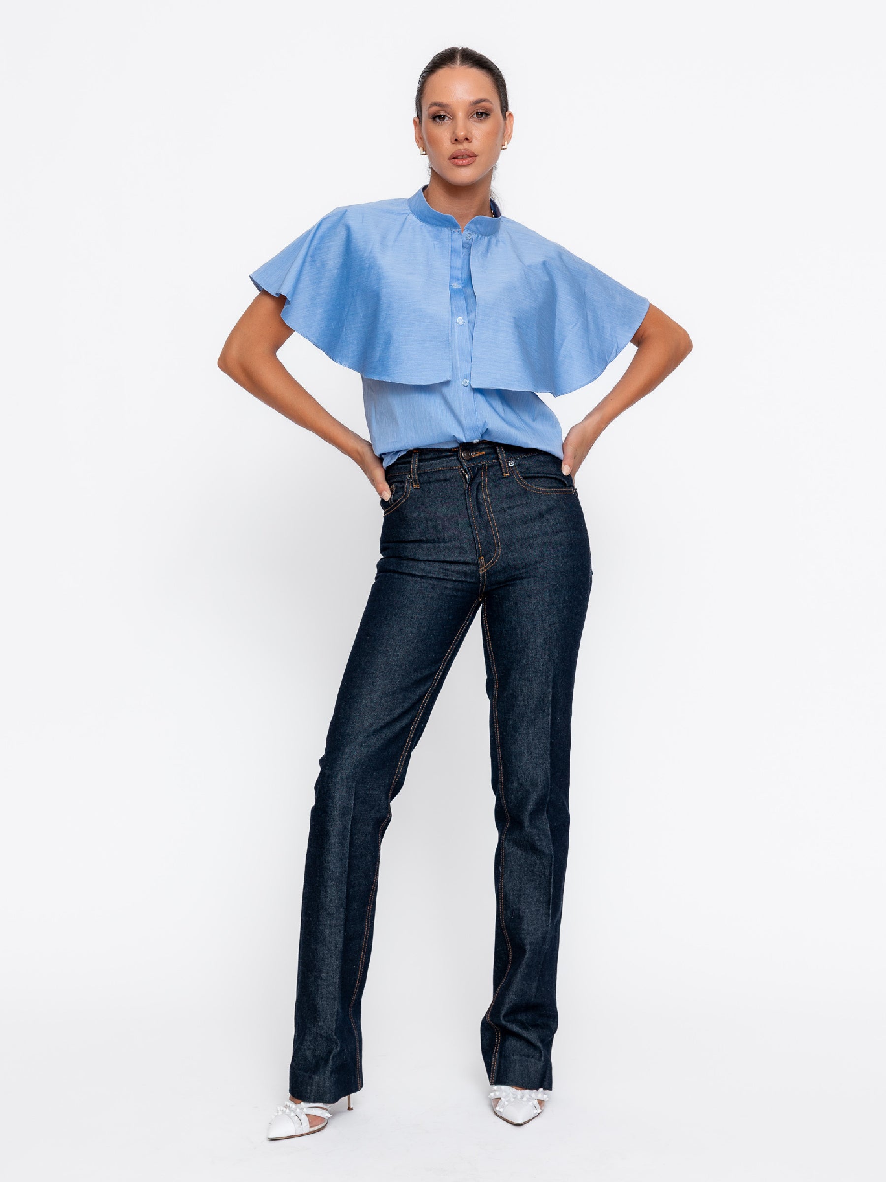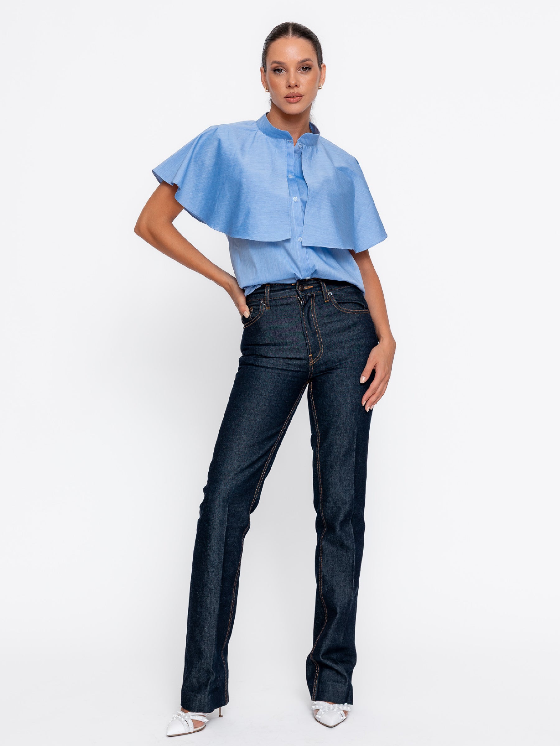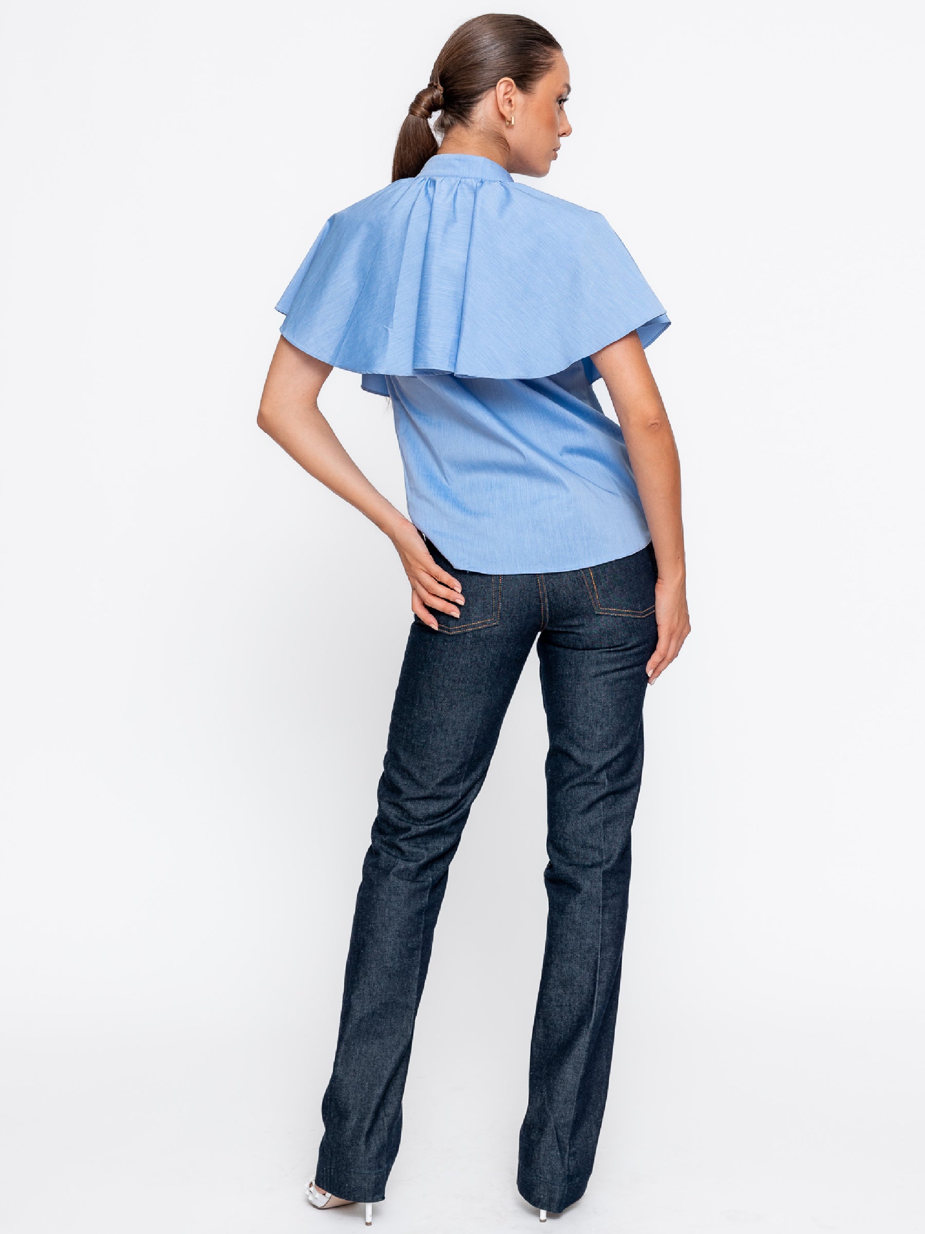 Cămașa din poplin cu capă tip volan pe umeri este reinterpretarea modernă a unei piese clasice, aducând un aer rafinat și elegant în garderoba ta.