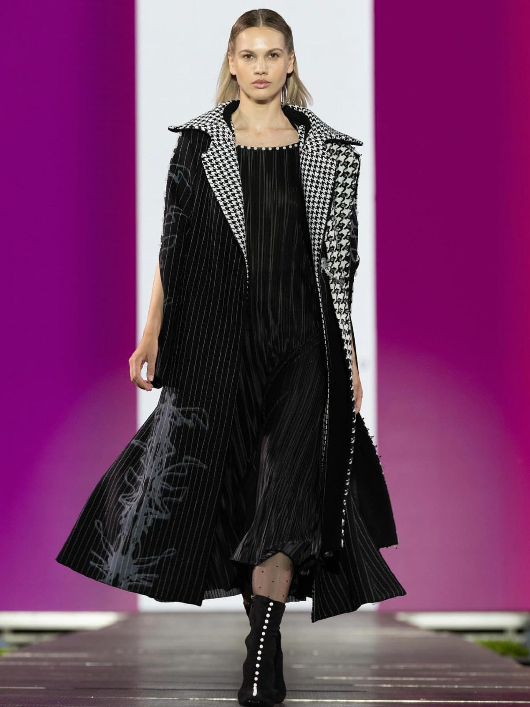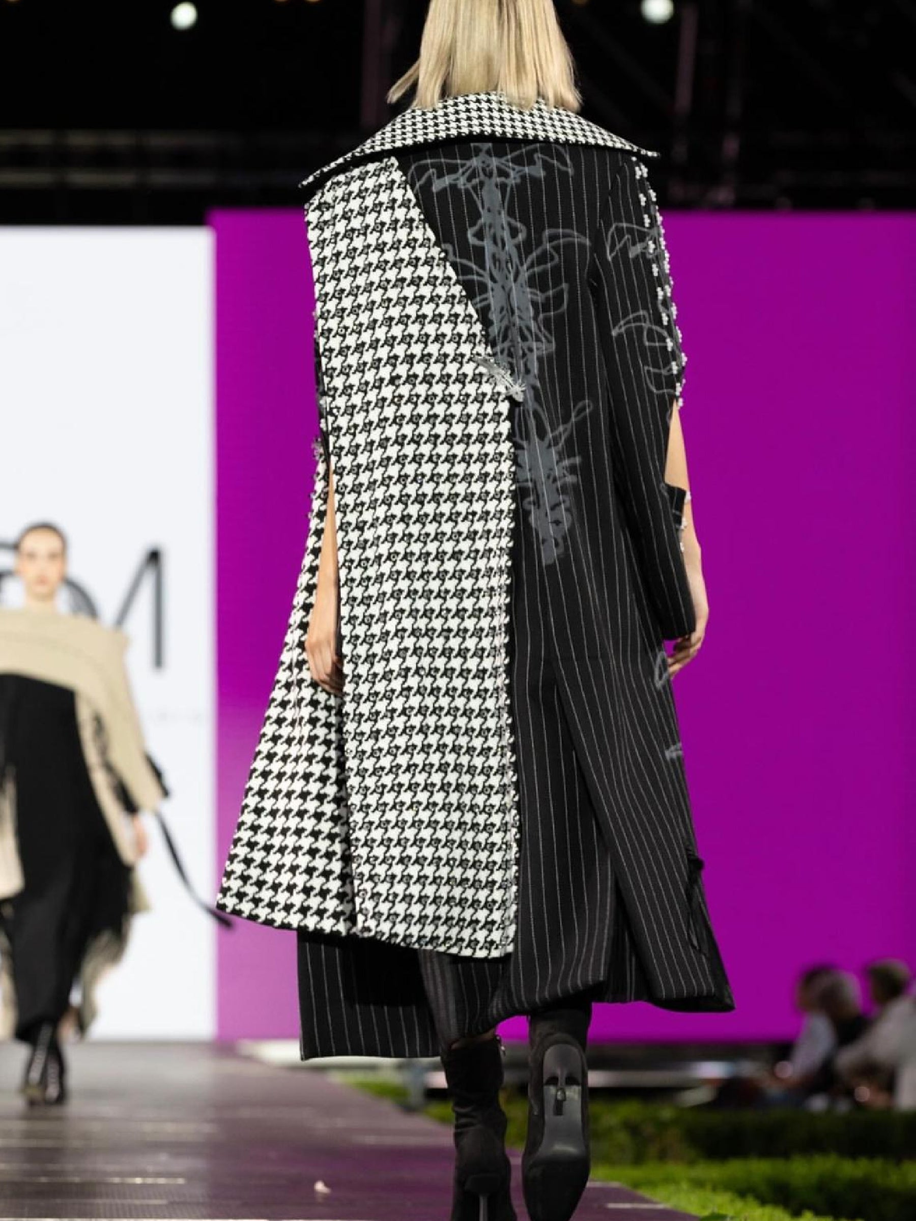 Paltonul este realizat din stofă neagră, evidențiat prin cusături geometrice liniare executate manual și printr-un print asimetric gri obținut printr-o tehnică neconvențională de serigrafie cu presă și cerneală serigrafică. Interiorul gulerului și bezetul sunt dublate cu stofă tip picior de cocoș, detaliu care adaugă un contrast subtil și elegant. Mânecele sunt prevăzute cu un decupaj discret, pentru a reda fluiditatea în timpul mișcării, și sunt decorate cu o broderie manuală din pietre semiprețioase de jad alb lăptos, sub formă de sfere.