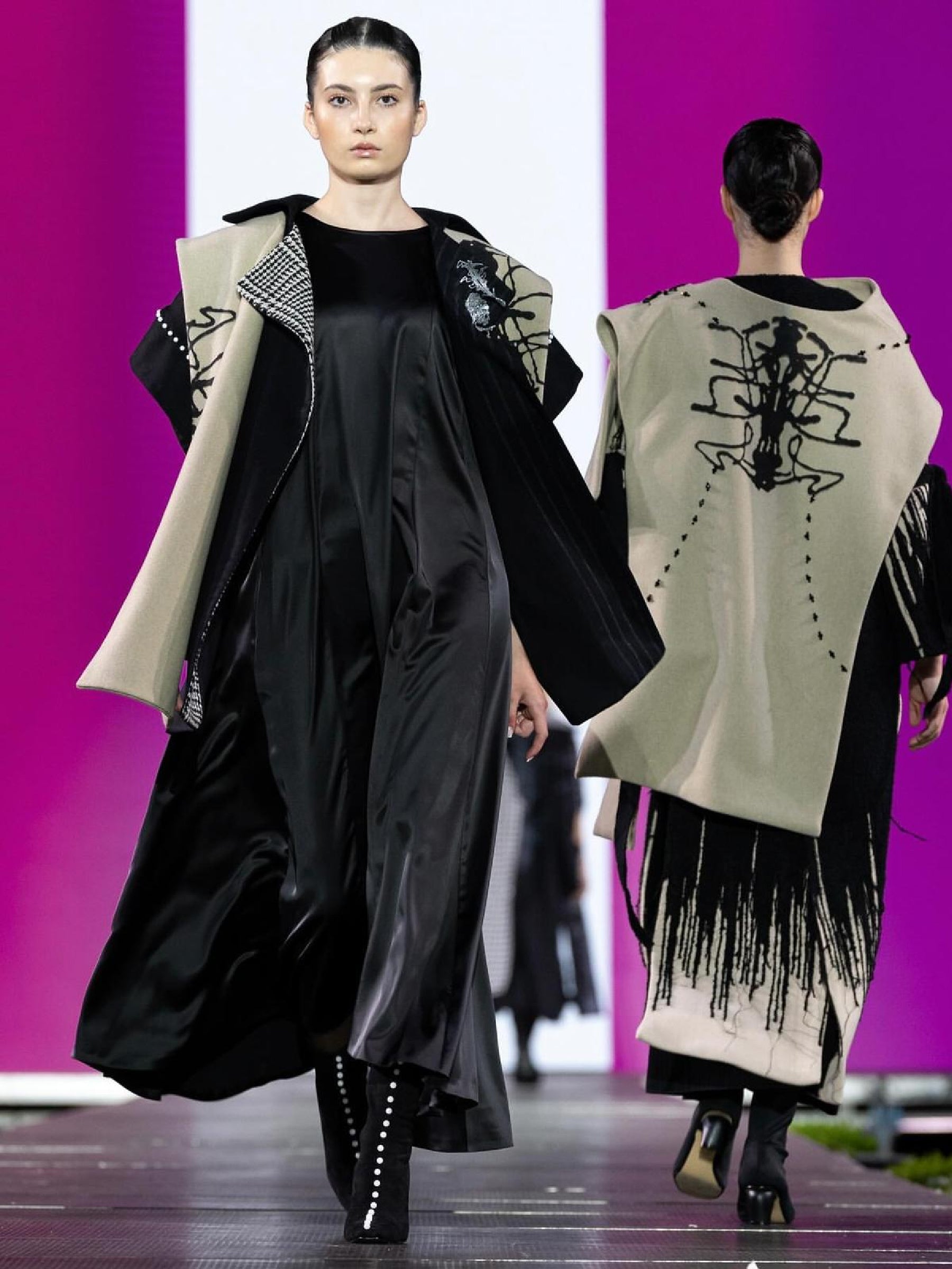 Capa bej, cu croi minimalist, este definită de un imprimeu asimetric realizat manual printr-o tehnică neconvențională de serigrafie cu presă și cerneală serigrafică, transformând fiecare exemplu într-o piesă unică.